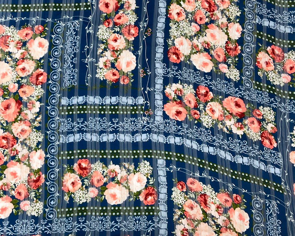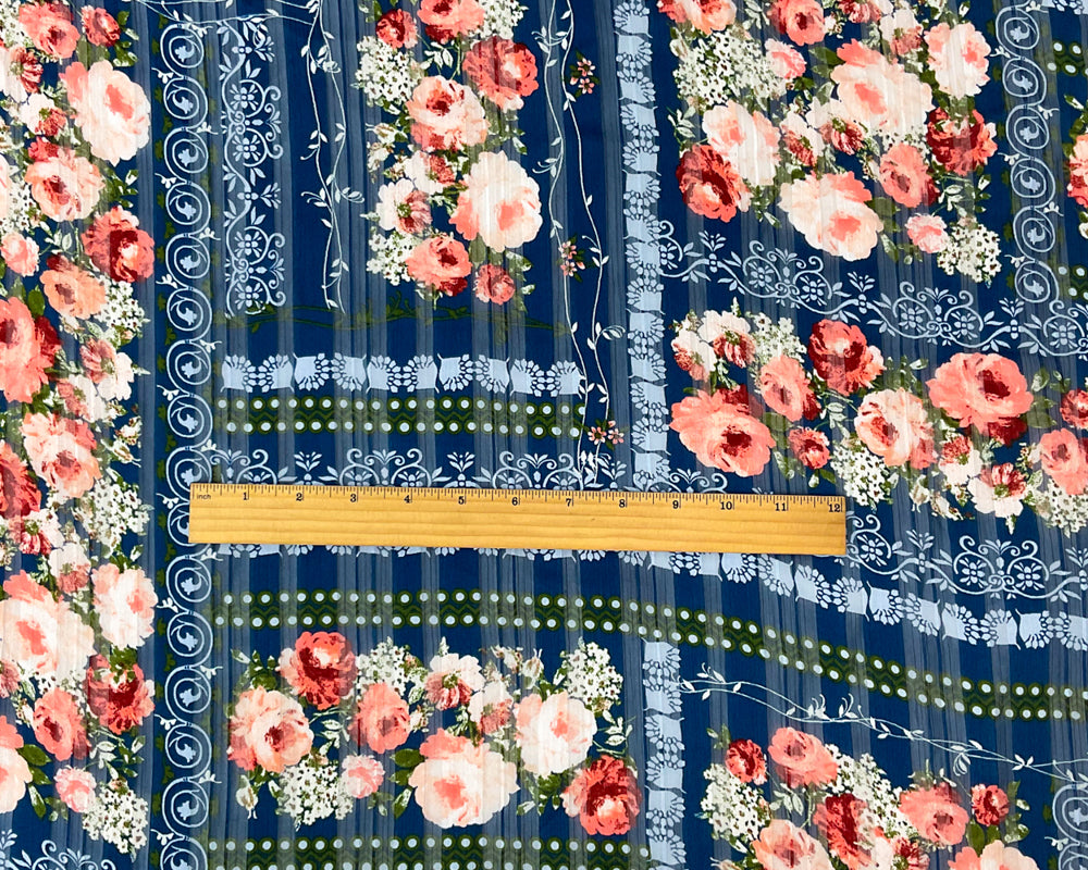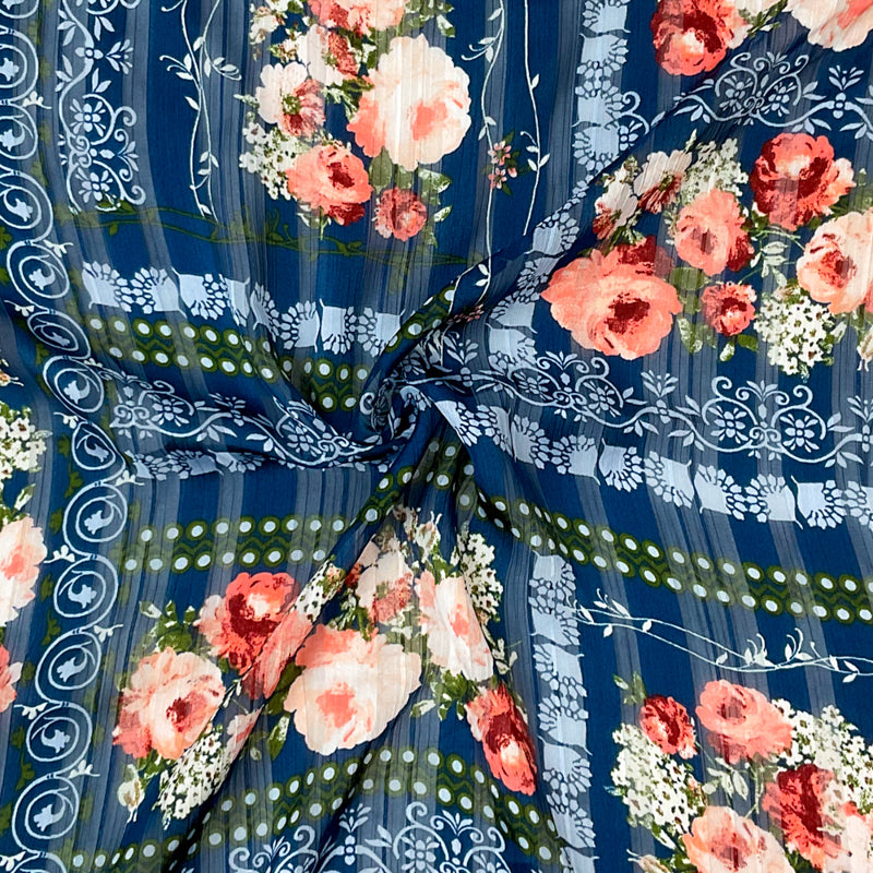 Blue-Multi Poly Floral Print Striped Satin Chiffon Woven Fabric