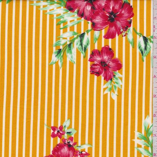 Orange Gold Stripe Hibiscus Double Brushed Jersey Knit Fabric