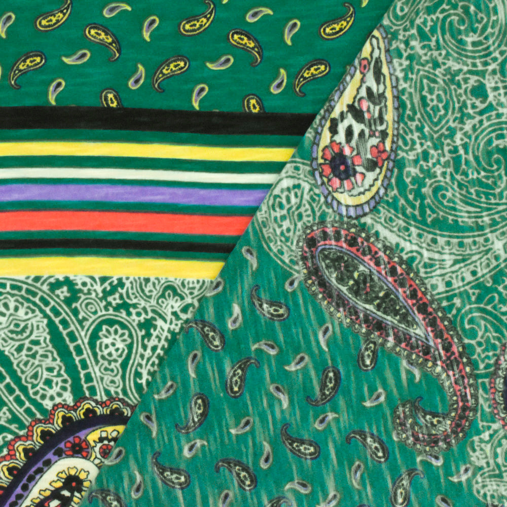 2 YD PC-Turquoise-Multi Paisley With Stripe Printed Stretch Poly Slub Jersey Knit Fabric