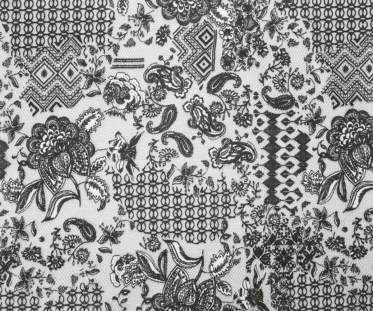 Black-White Poly Floral Patch Printed Lace Mesh Knit Fabric