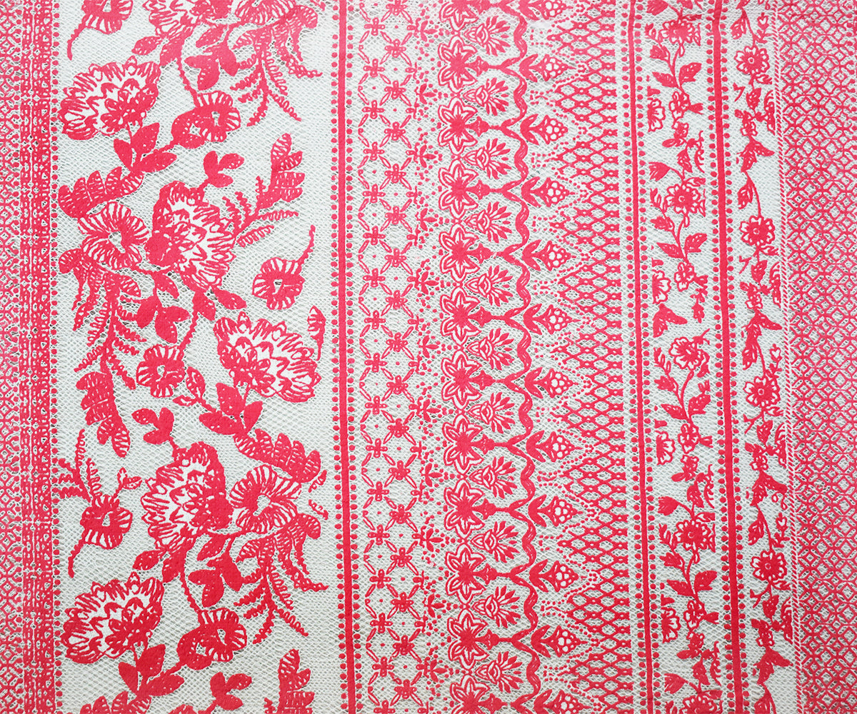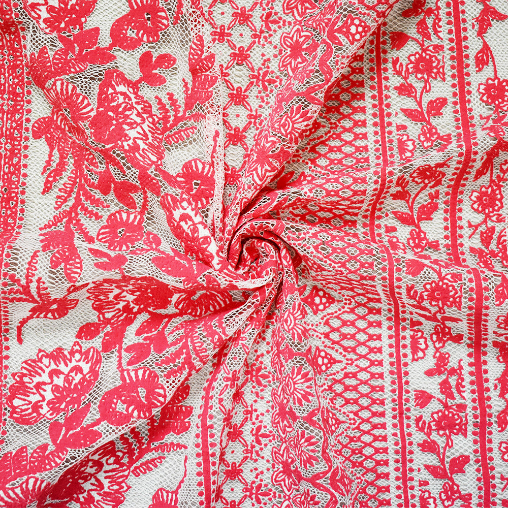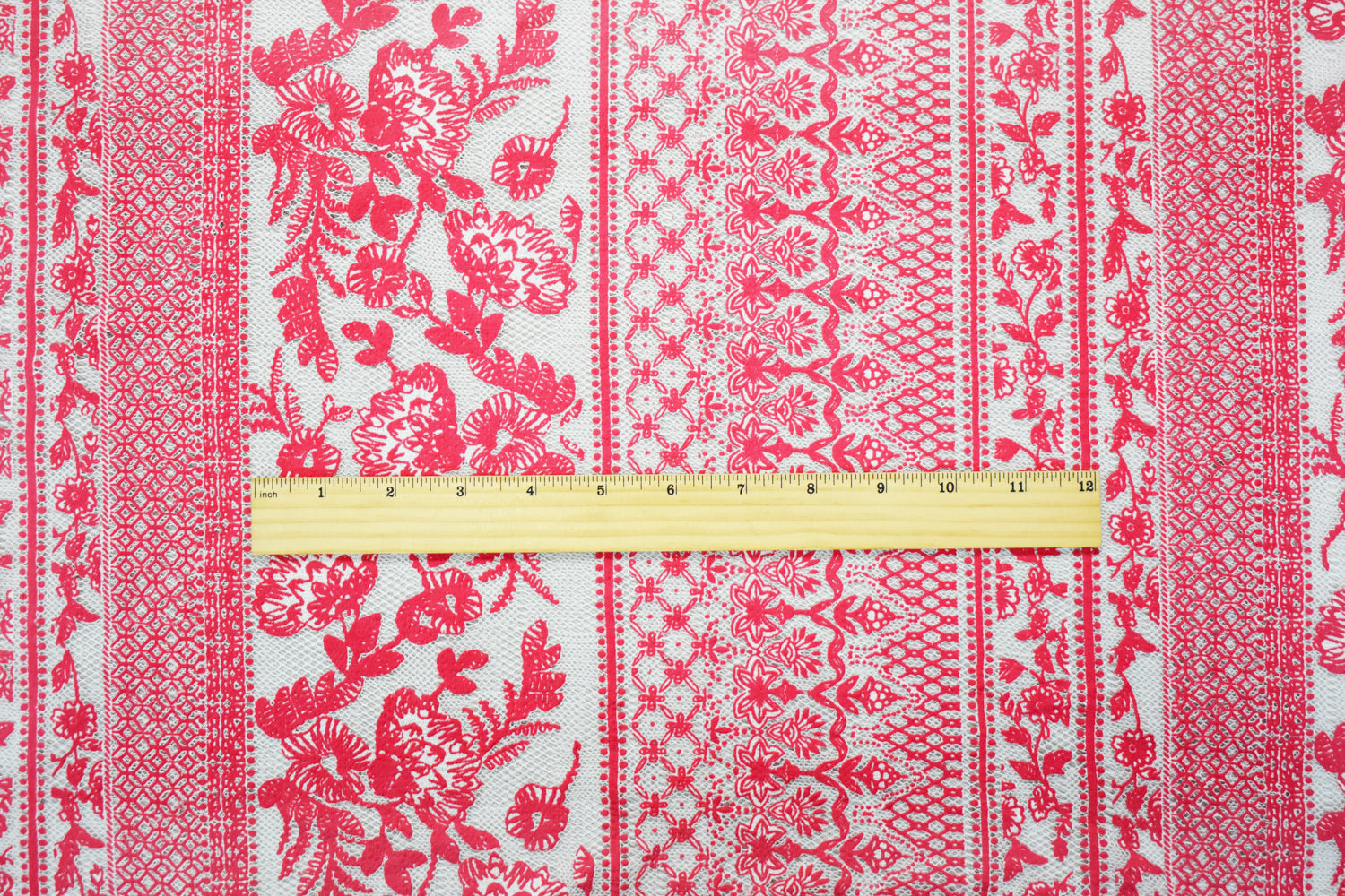 Coral Red-White Cotton-Nylon Multi Stripe Pattern Lace Mesh Knit Fabric