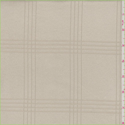 Beige with golden undertones and a slight sheen. A lightweight polyester fabric with a sueded surface that is embossed with a windowpane plaid design. Soft to the touch, drapes in folds. Suitable for dresses and blouses. Machine washable.