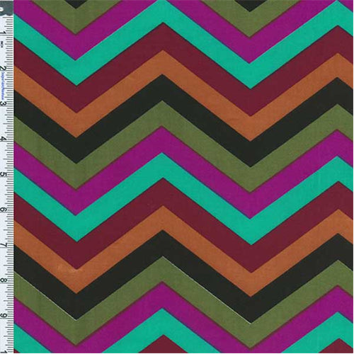 Lightweight Slinky Poly Stretch Knit Chevron Stripe Print Fabric By the Yard, Multicolor. Very lightweight printed stretch knit, slick hand feel, slinky drape. Semi-sheer to sheer: suitable for lightweight stretch tops, if using for dresses a lining will be necessary.
