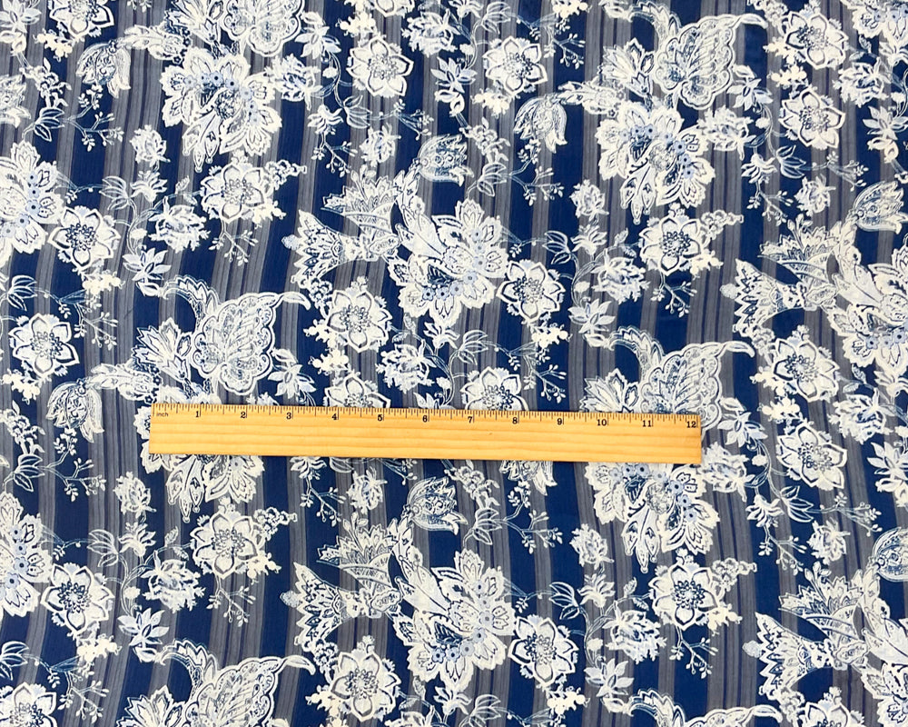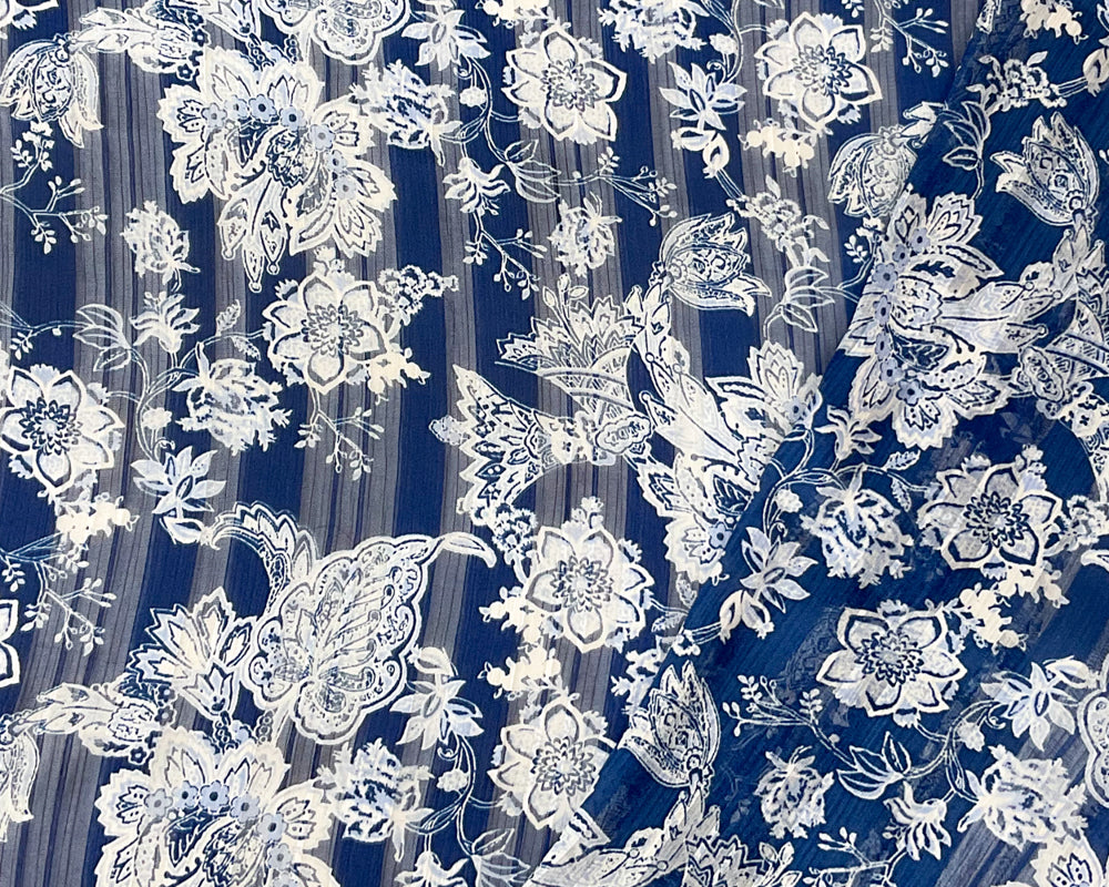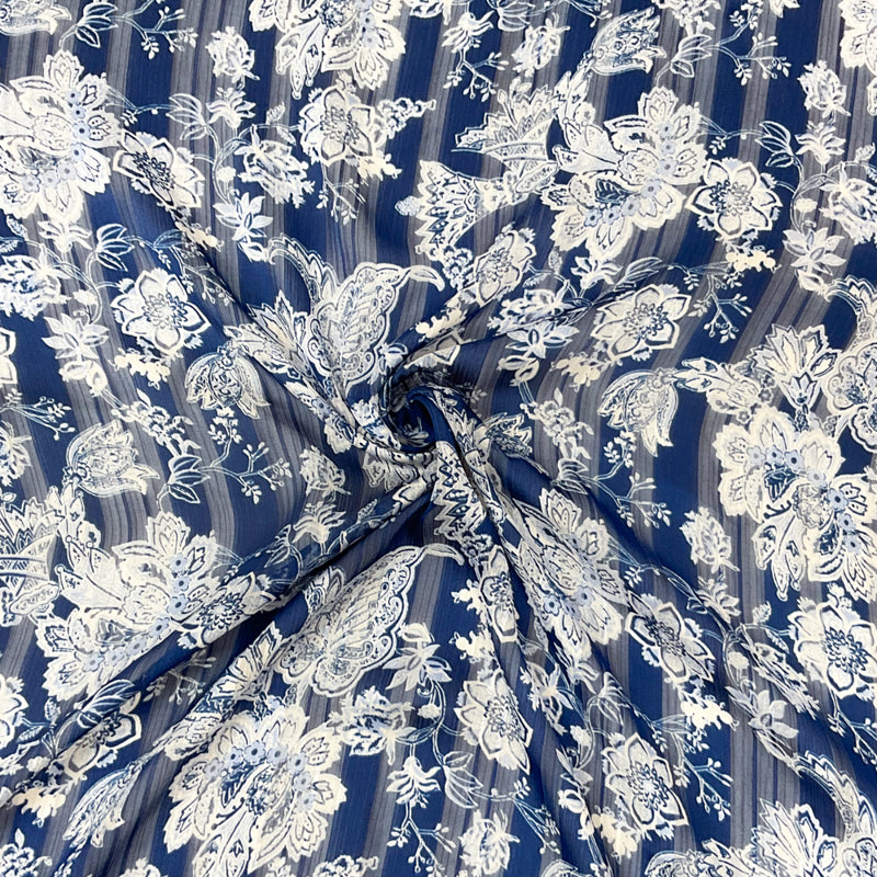 Blue-White Poly Floral Printed Satin Stripe Chiffon Woven Fabric