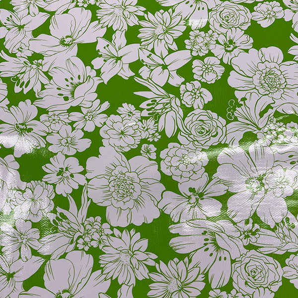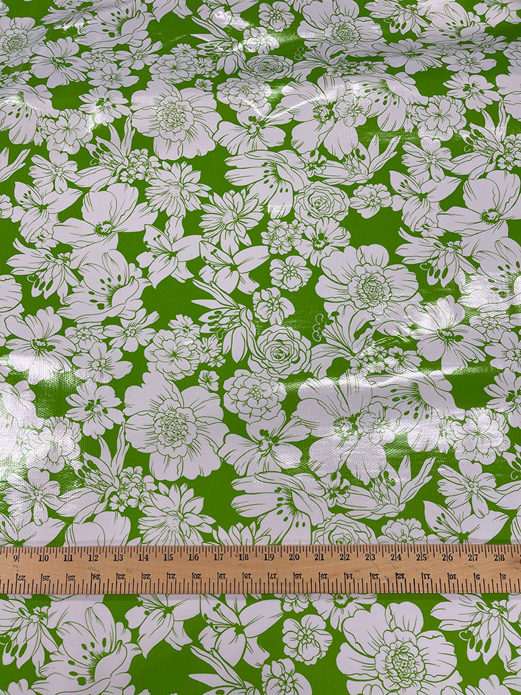 White Floral Print on Bright Green Oilcloth Fabric