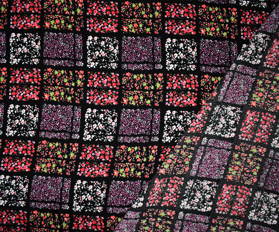 -Black-Red-Multi Poly Square Floral Plaid Printed Moss Crepe Woven Fabric