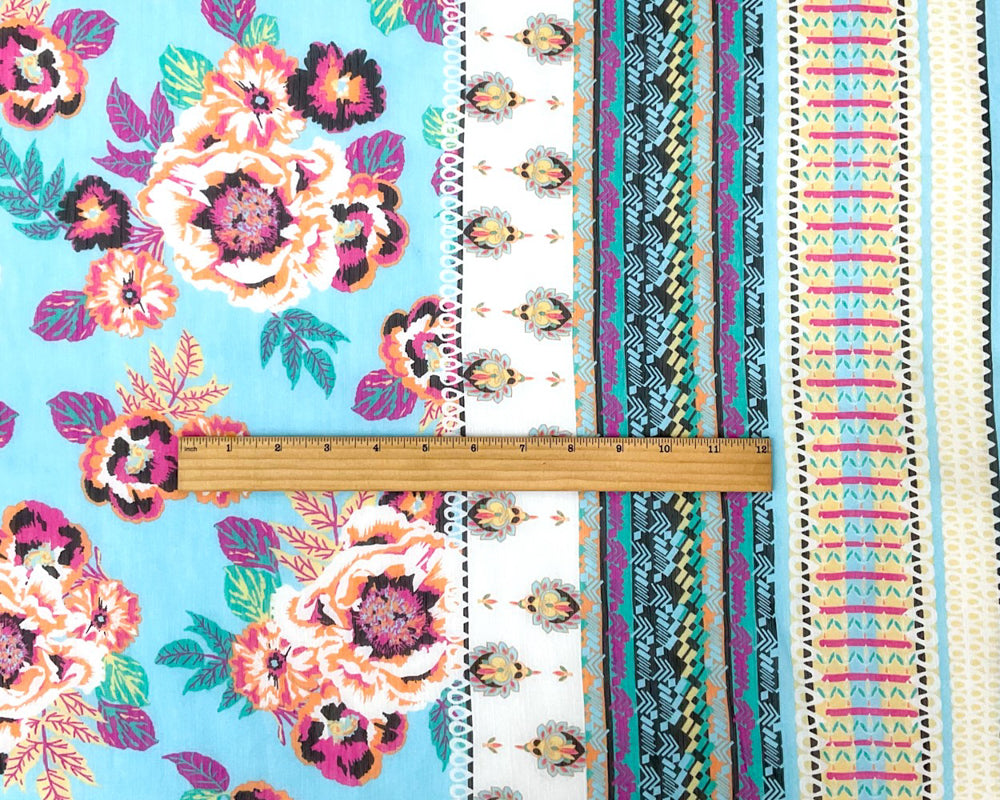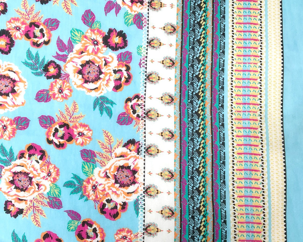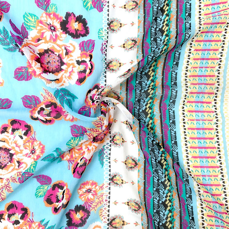 Blue-Multi Poly Floral Border Printed Yoryu Chiffon Woven Fabric