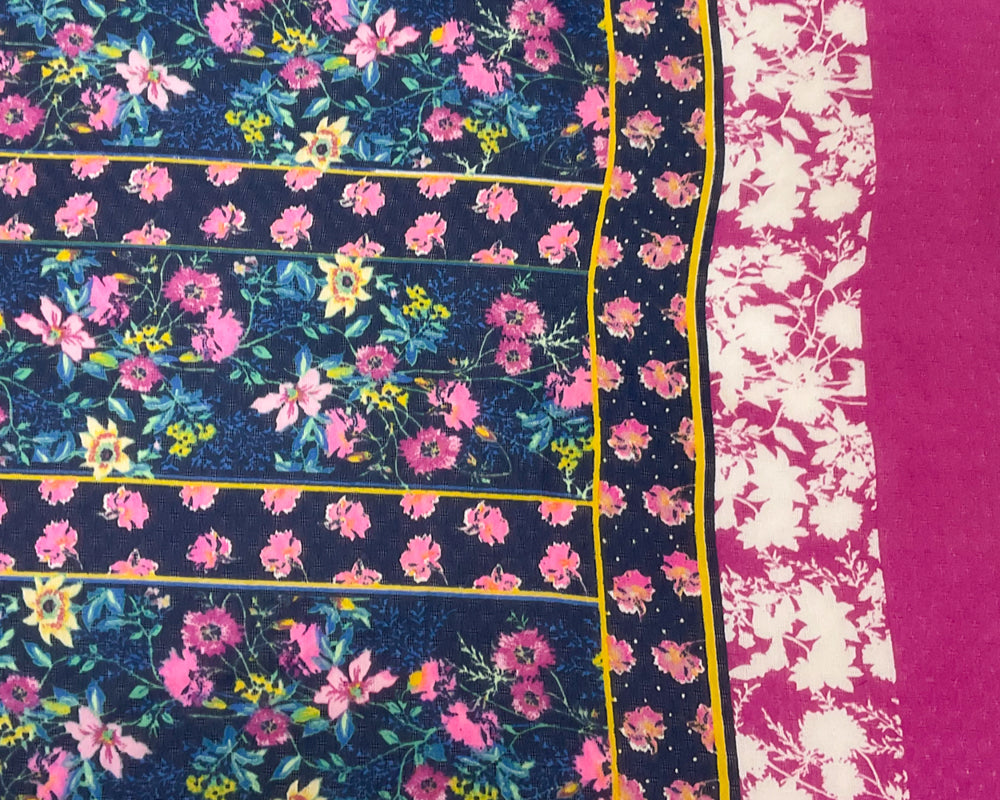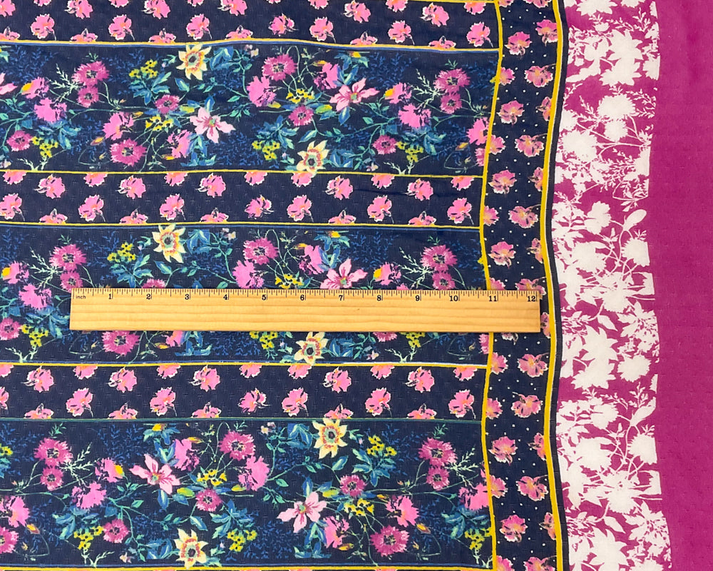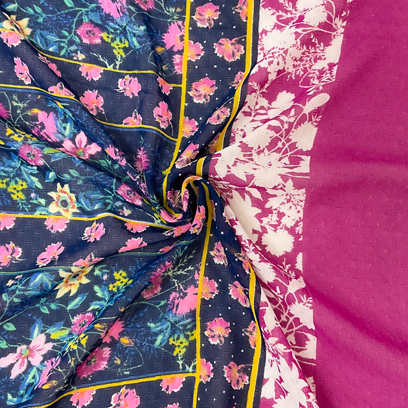 Blue-Multi Poly Stripe Floral Border Print Dobby Chiffon Woven Fabric
