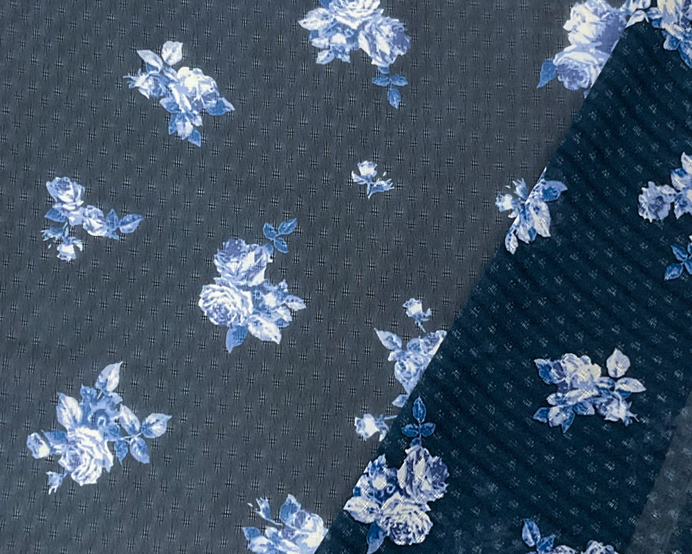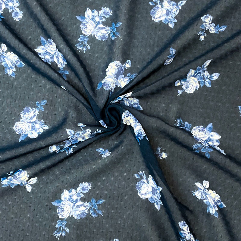 Blue-White Poly Floral Printed Dobby Chiffon Woven Fabric