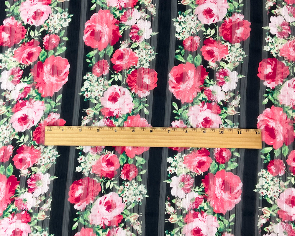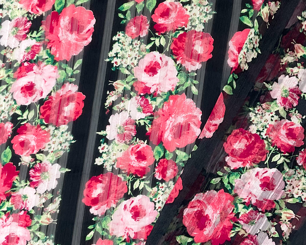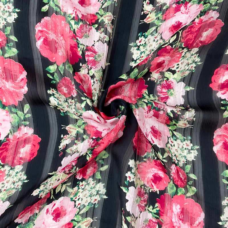 Red-Multi Poly Floral Printed Satin Stripe Chiffon Woven Fabric