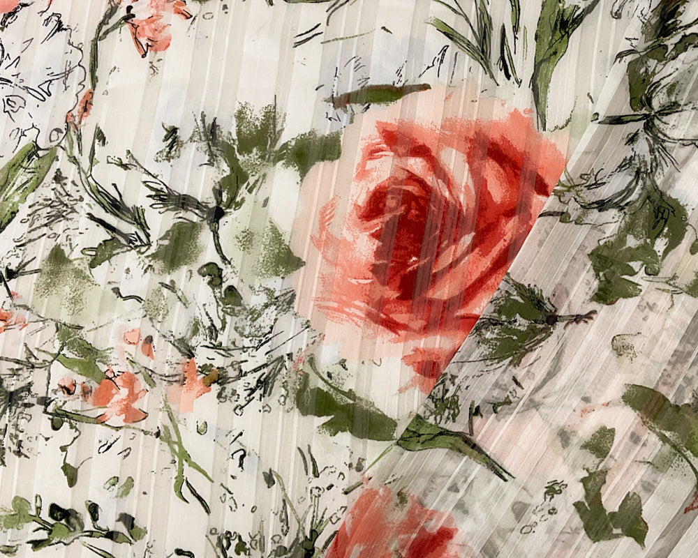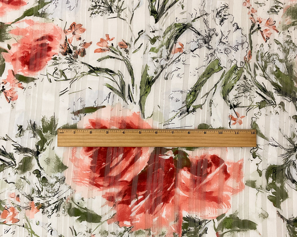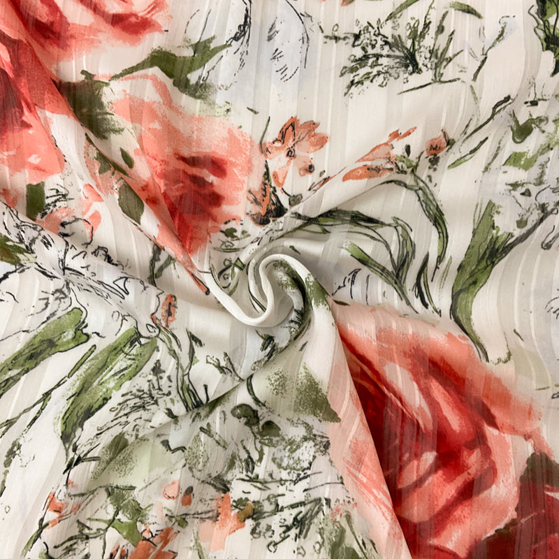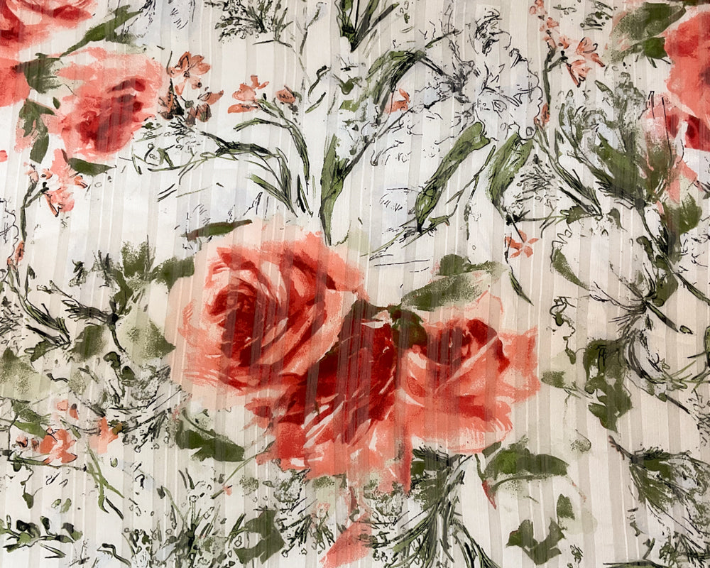 -White-Multi Poly Floral Printed Satin Stripe Chiffon Woven Fabric