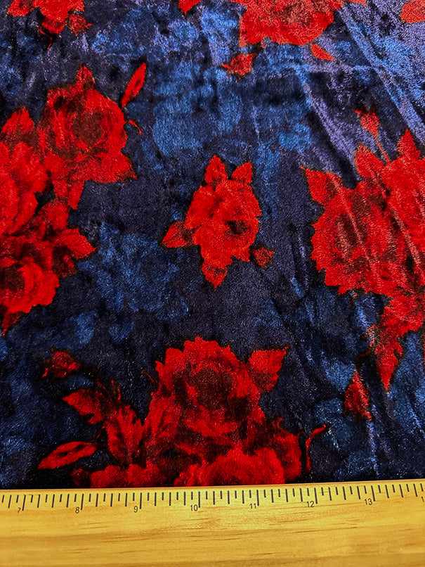 Navy and Red Floral Print Stretch Panne Velour Fabric
