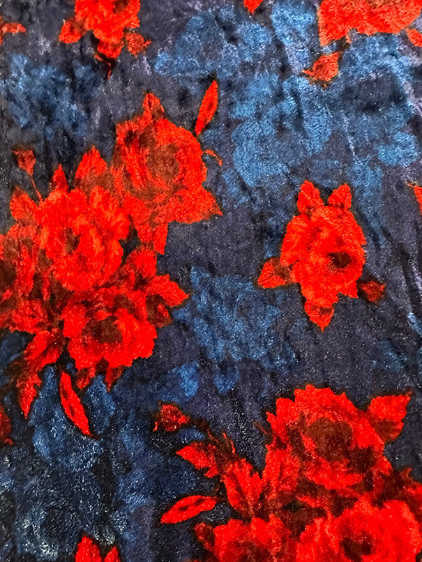 -Red Rose Print on Navy Blue Stretch Panne Velour Fabric