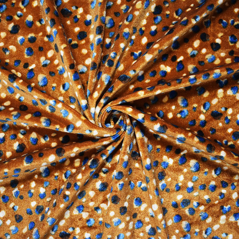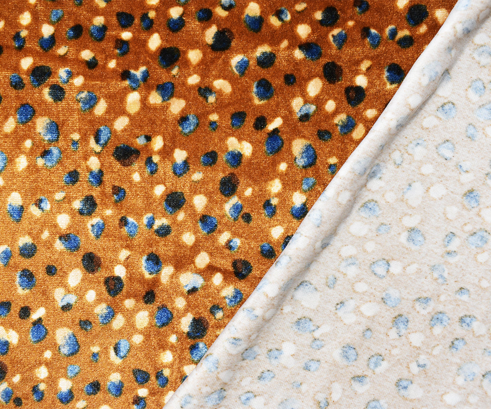 -Plush velvet knit with an abstract spot-like print pattern. The poly-spandex blend offers comfortable stretch and easy recovery. Features a dense, soft pile with a luxurious texture, ideal for elegant and cozy apparel.