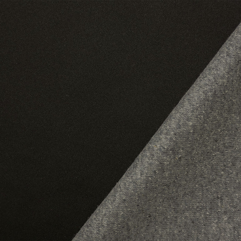 -Double-knit fabric, heather surface texture on one side, solid black solid surface knit on the other side