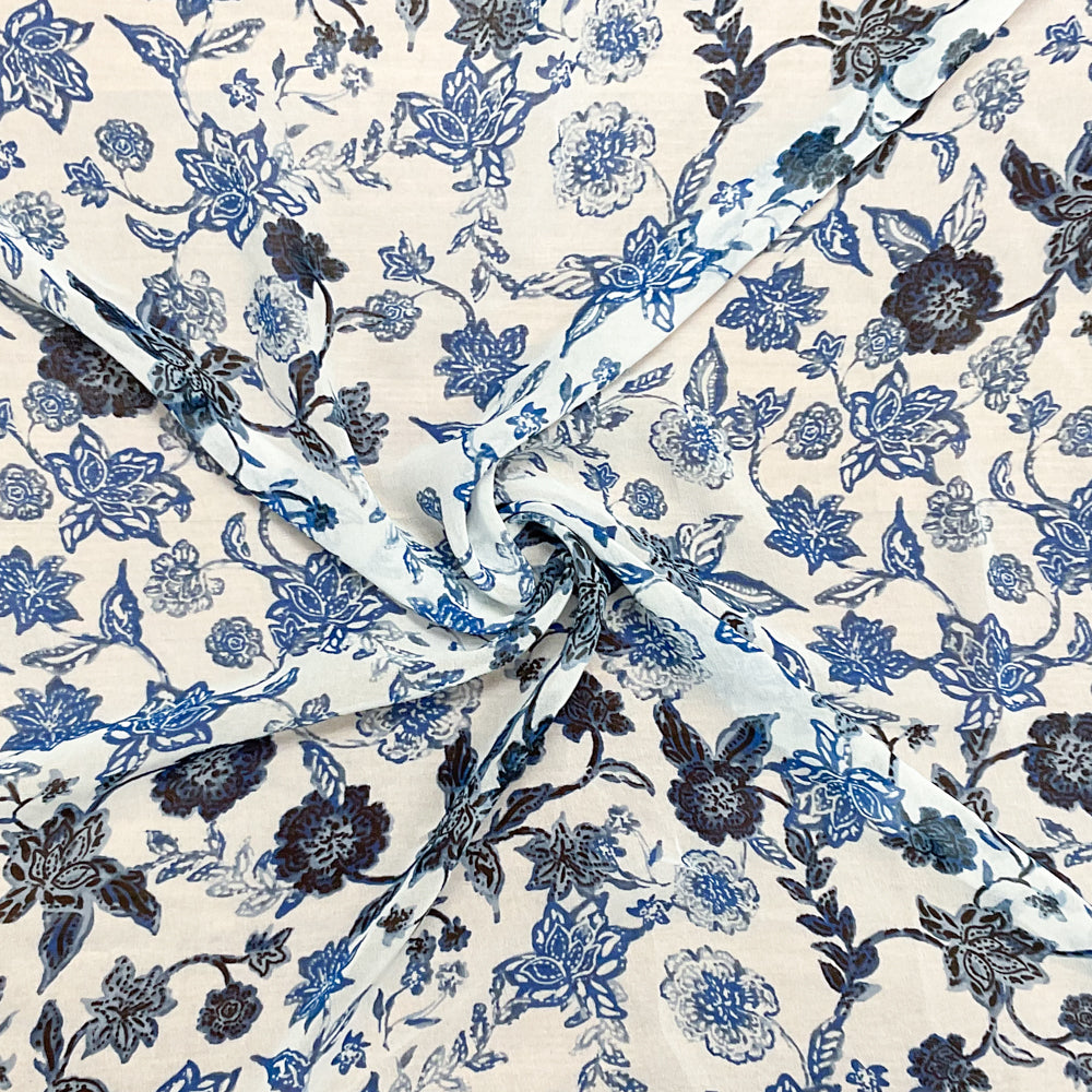 Blue-White Poly Floral Printed Chiffon Woven Fabric