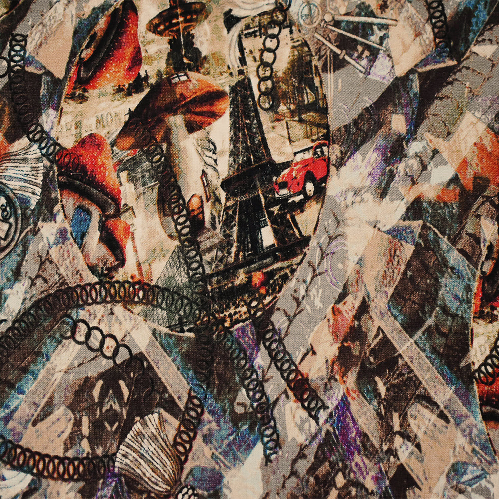 Brown-Beige-Multi Abstract Paris Vintage Time Printed Linen Woven Fabric