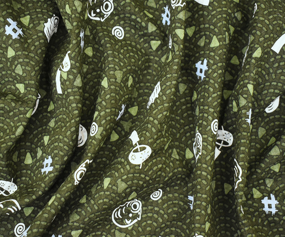 -100% cotton plain woven shirting fabric with a crinkled feel printed with an abstract pattern featuring a pig-like figure abstract shapes, & more. Line if needed.