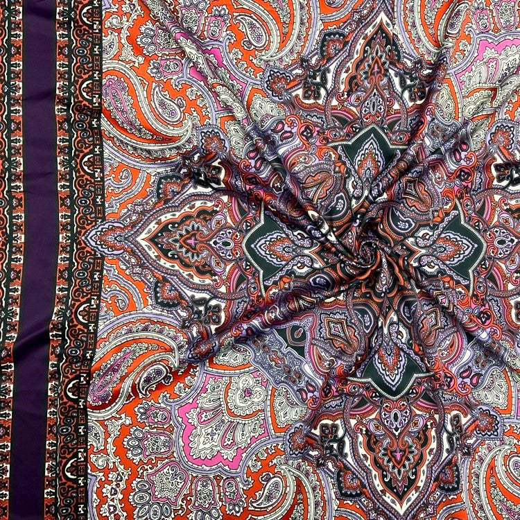 Purple-Orange-Multi Poly Paisley Bandana PANEL Printed Charmeuse Woven Fabric