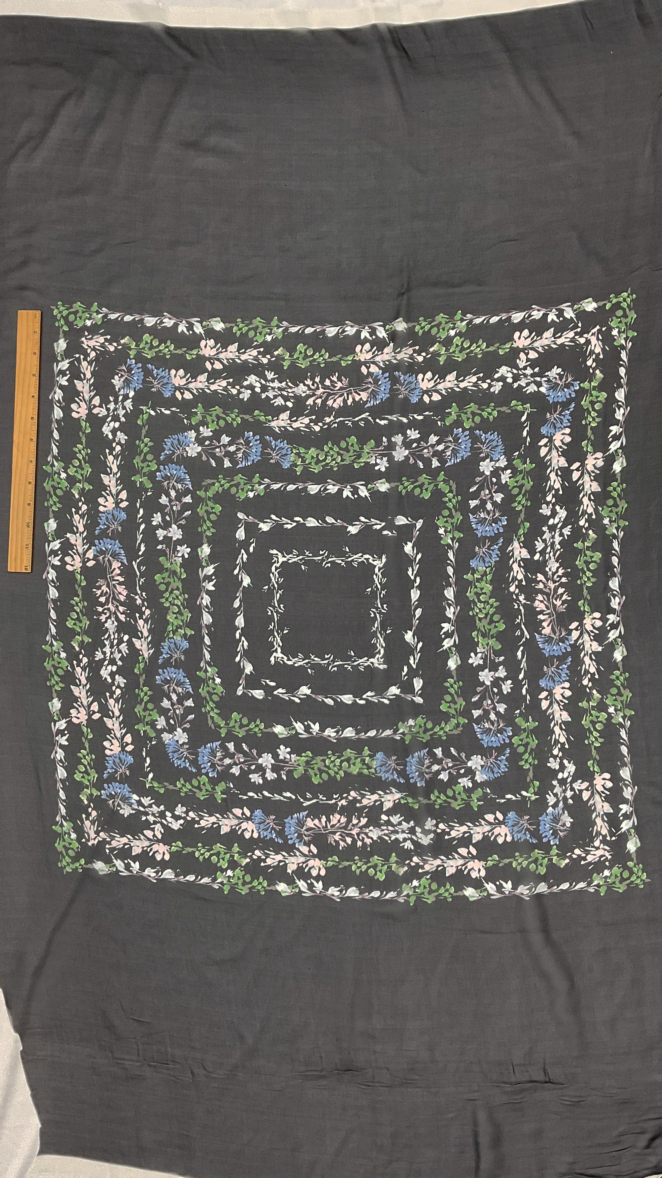 -100% silk chiffon fabric printed with a floral border frame pattern. Please note: each fabric is sold by panel piece. Each fabric will be approx. 52" x 33" with a 26" x 26" printed pattern.