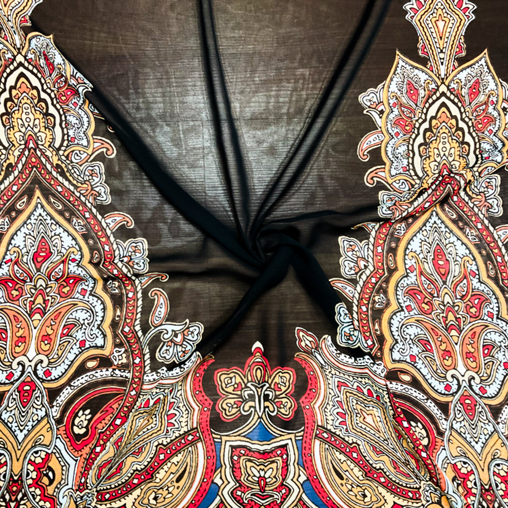 Black-Orange-Multi Poly Paisely Baroque Border Printed Chiffon Woven Fabric