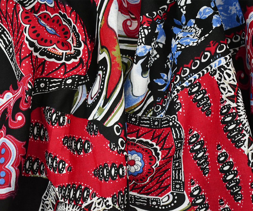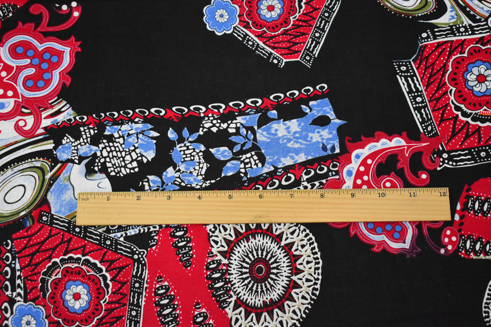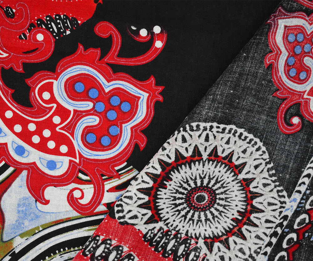 Black-Red-Blue Abstract Tribal Pattern Printed Linen Woven Fabric