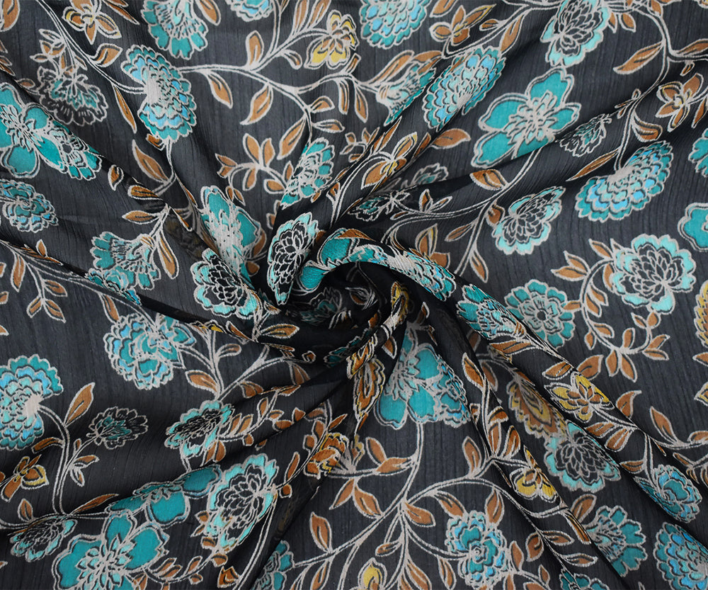 Black-Turquoise-Multi Floral Printed Poly Yoryu Chiffon Woven Fabric