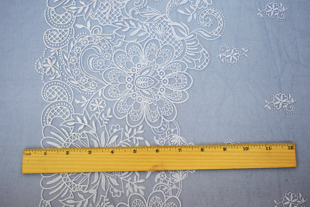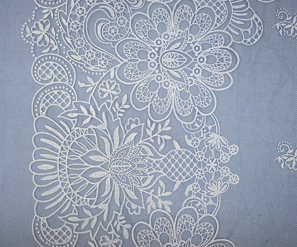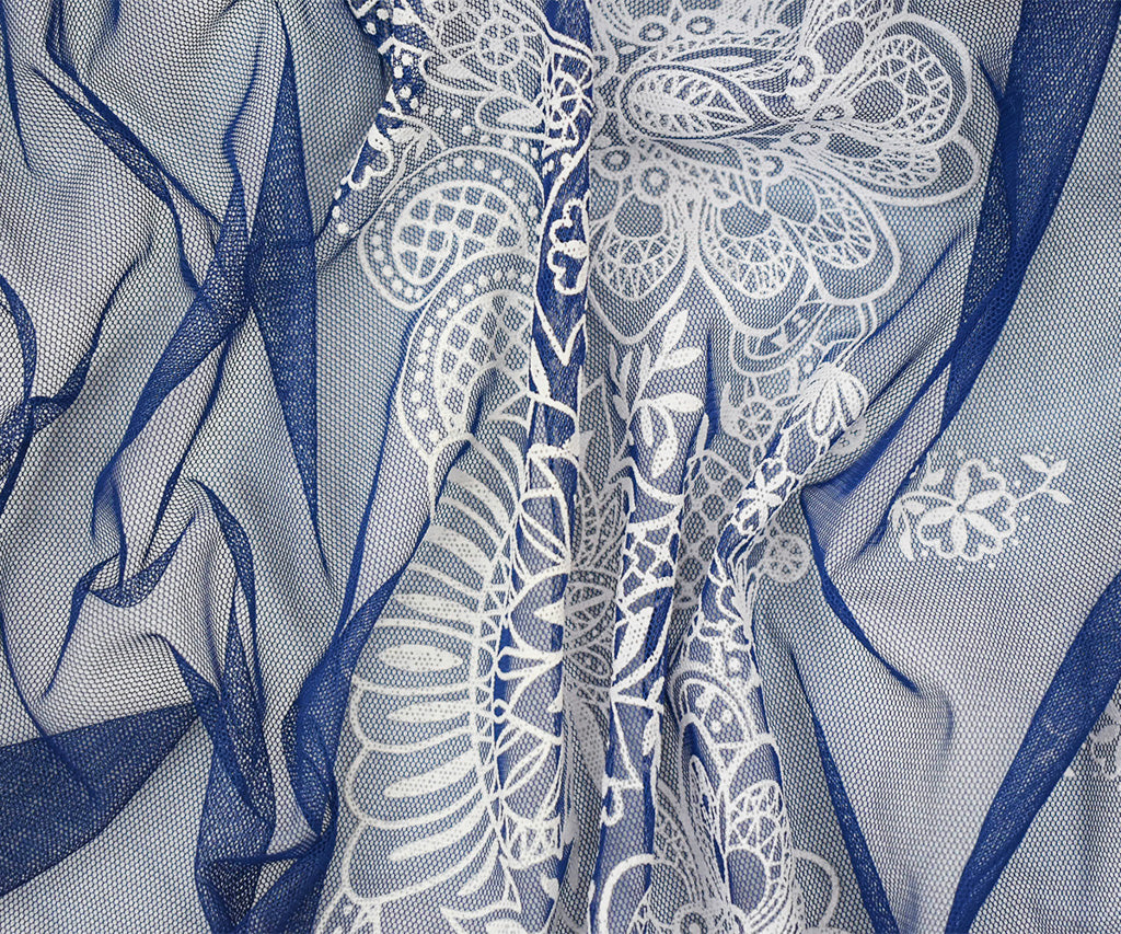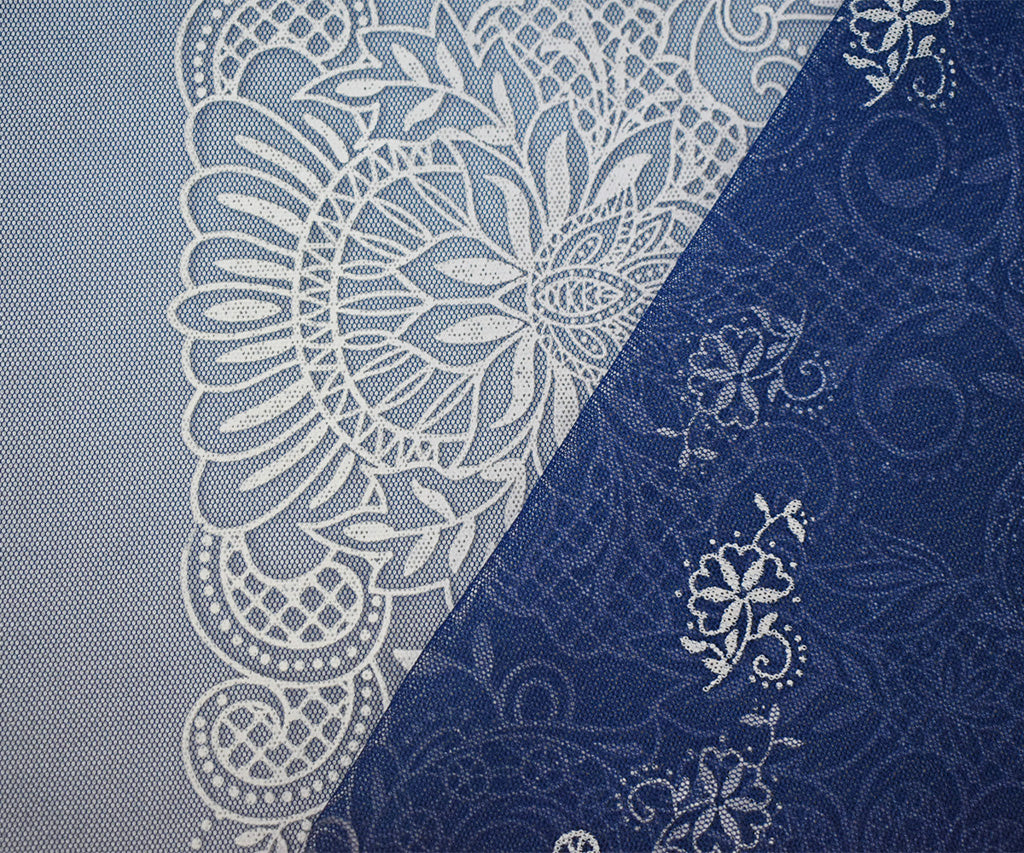 Blue-White Nylon Floral Border Printed Mesh Tulle Knit Fabric