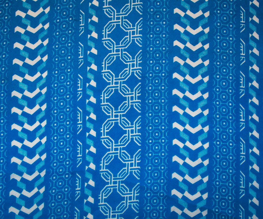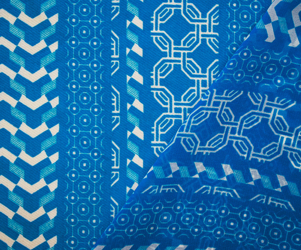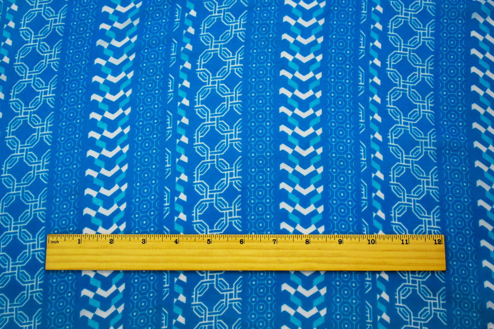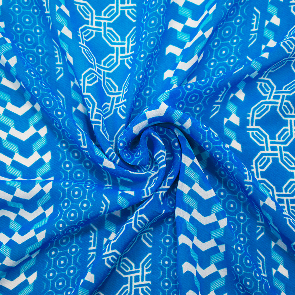 Bright Blue-White Moroccan Geo Striped Printed Chiffon Woven Fabric