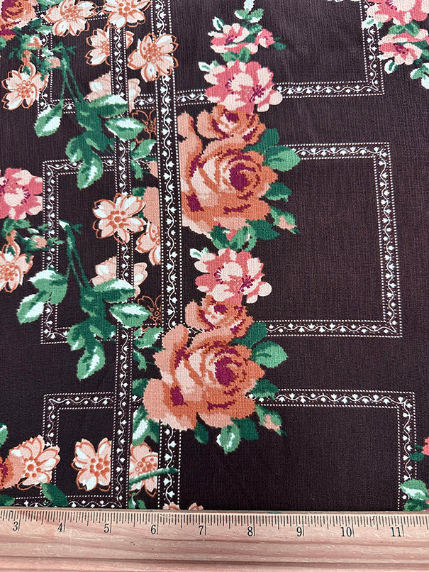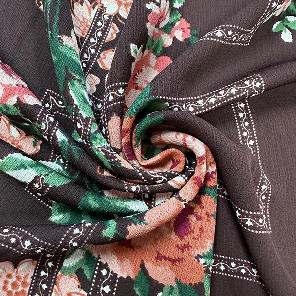 -White, Green, Peach, Pink, Orange, & Gold Floral and Trellis Print on Brown Poly High Crepe Fabric