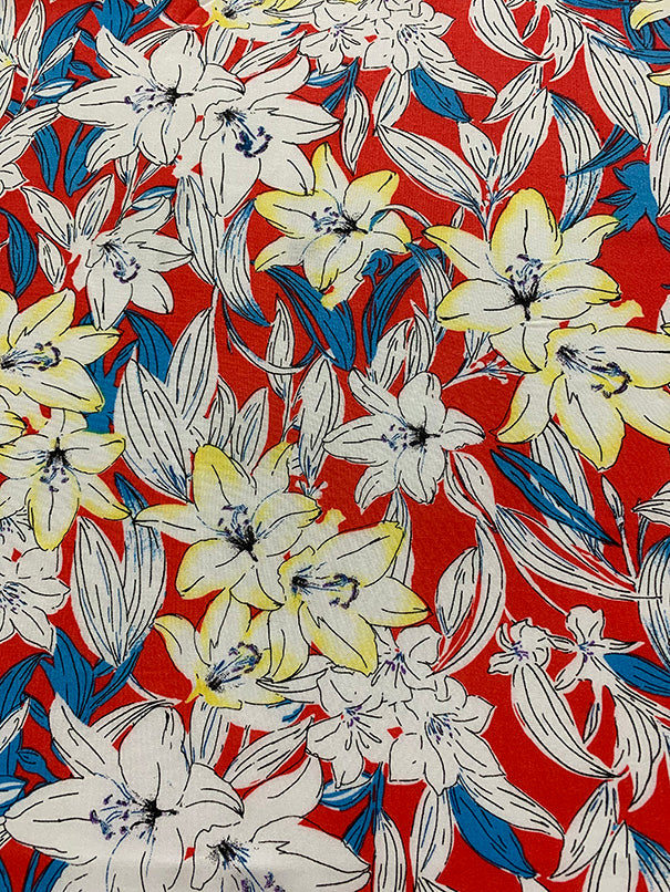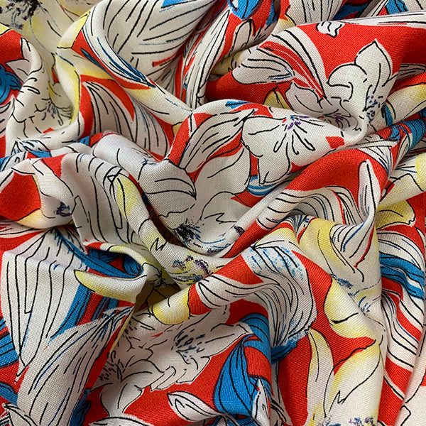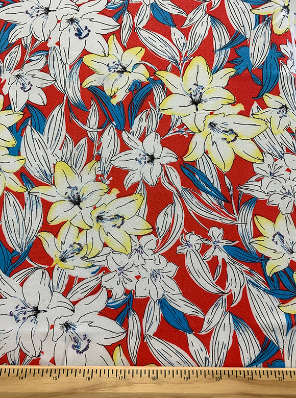 Flamingo Red Lillies Multi Print Rayon Challis Fabric