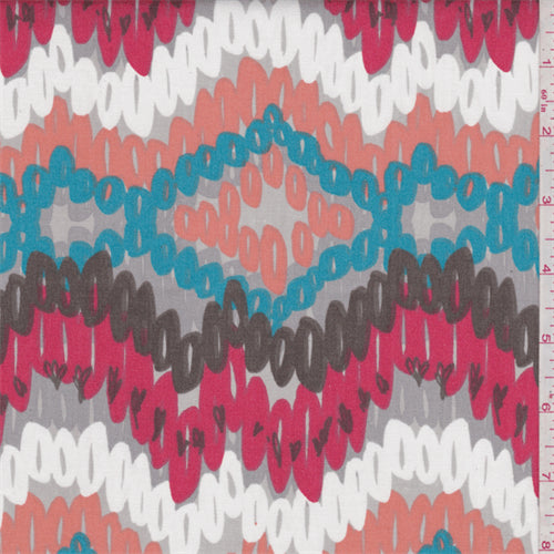 Grey, raspberry red, dark brown, aqua blue, coral orange and white horizontal loop chevron print by Premier Prints. This lightweight 7 oz cotton poplin has a smooth surface and crisp hand.