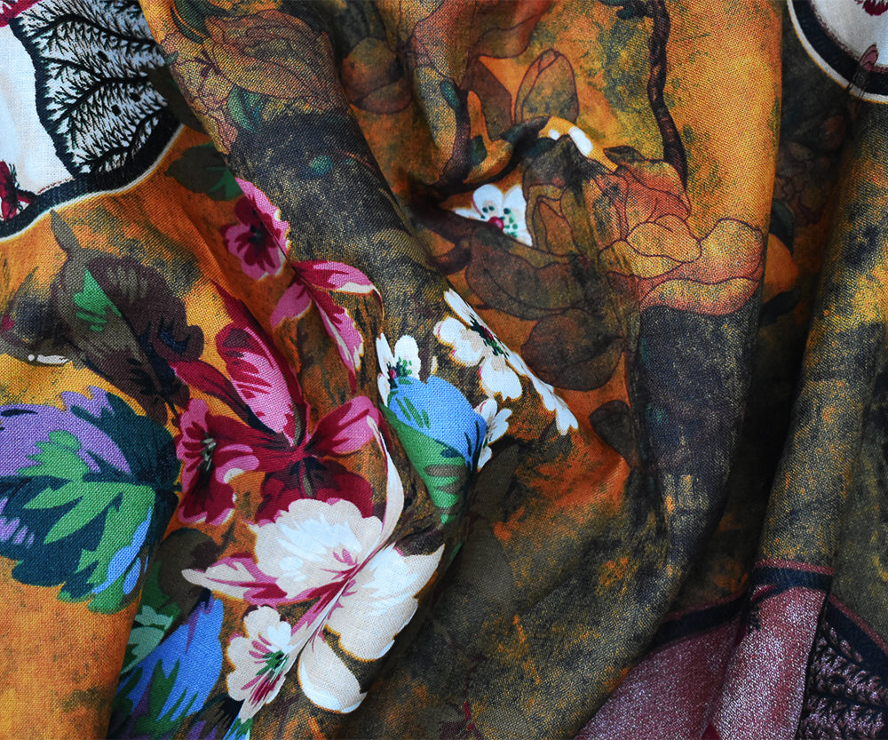 Orange-Red-Multi Floral Circle Art Printed Linen Woven Fabric