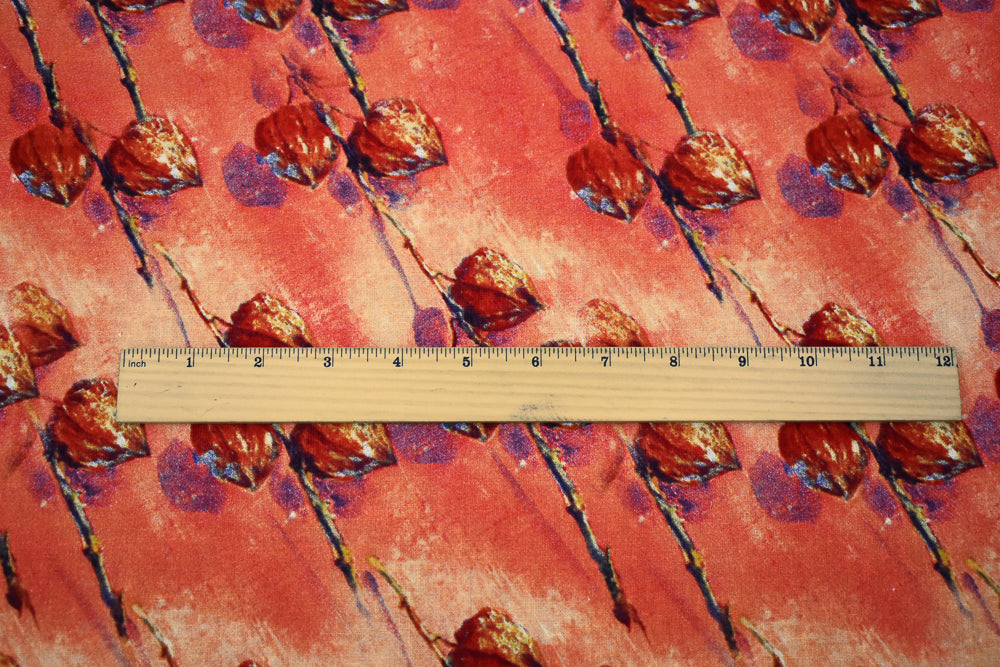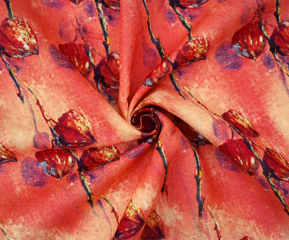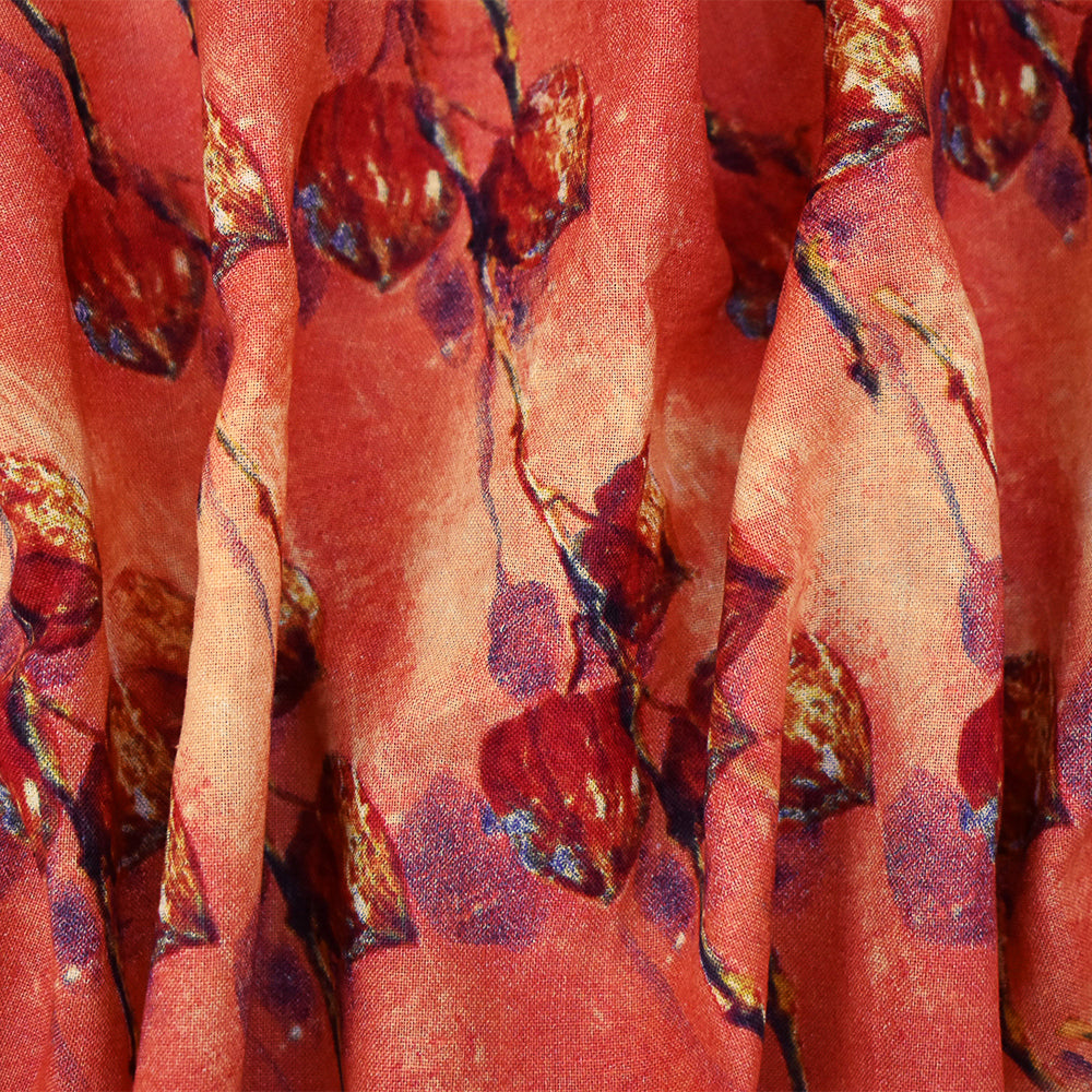 Orange-Red-Multi Leaf and Branches Pattern Printed Linen Woven Fabric