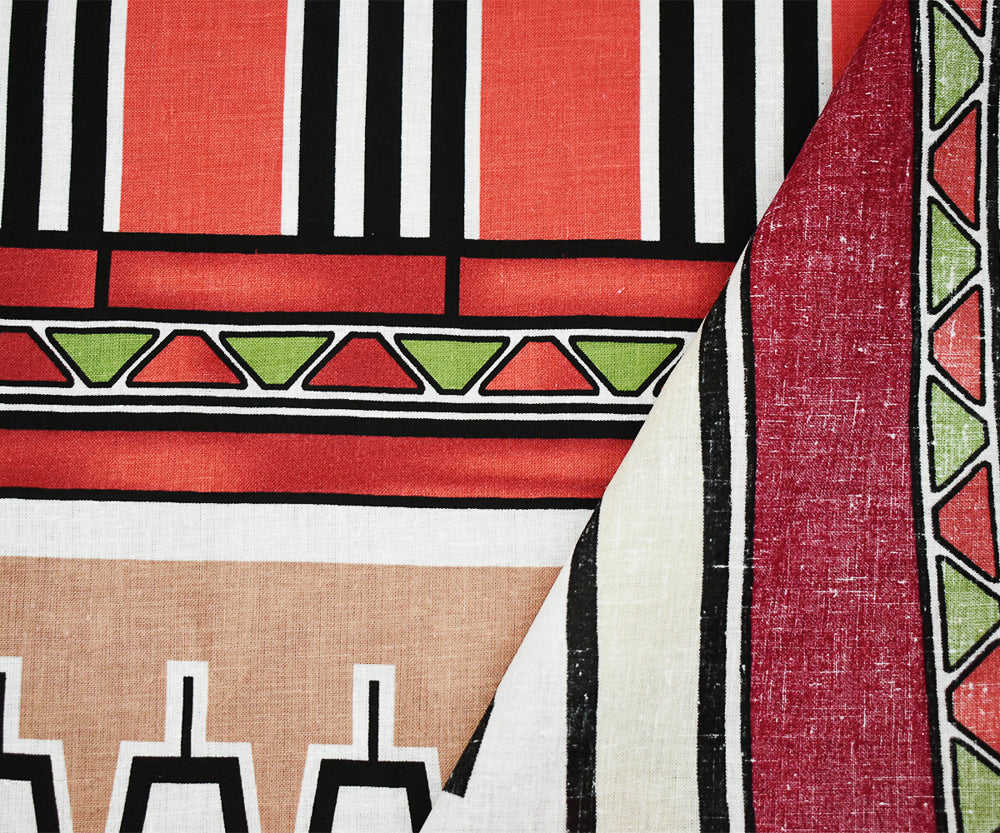 Red-Green-Multi Abstract Aztec Stripe Pattern Printed Linen Woven Fabric