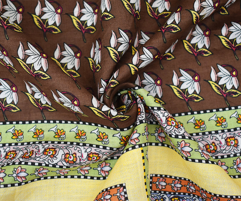 Yellow-Brown-Multi Floral Bandana Pattern Printed Linen Woven Fabric